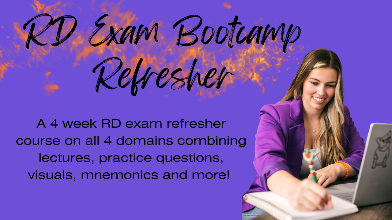 This course is a 26+ video, 26+ study guide, 600+ practice question, and ~45 hour step by step guide to pass the RD exam! I will take you through testing techniques, domain 1 - domain 4 (everything from food science to MNT to food borne illnesses and Calculations). Most videos will come with a study guide to guide to take notes during the videos. The course has 45 days of access which is a 6 week timeline to finish studying and prepare you to take the RD exam! This course is $100 cheaper than buying my recordings all individually (with EXCLUSIVE recordings only in the course including the sentence structure class, situations class, finance/budget class, 50 question test/answer key, EN/PN practice calculations, and FS practice calculations. Plus the study guides are included in this course versus the individual recordings! NO REFUNDS FOR ANY SUCH REASON INCLUDING FAILING TO FINISH COURSE, FAMILY EMERGENCIES, LACK OF DOWNLOAD STUDY GUIDES AND MORE PER CONTRACT. COURSE EXPIRES 45 DAYS FROM PAYMENT DATE!